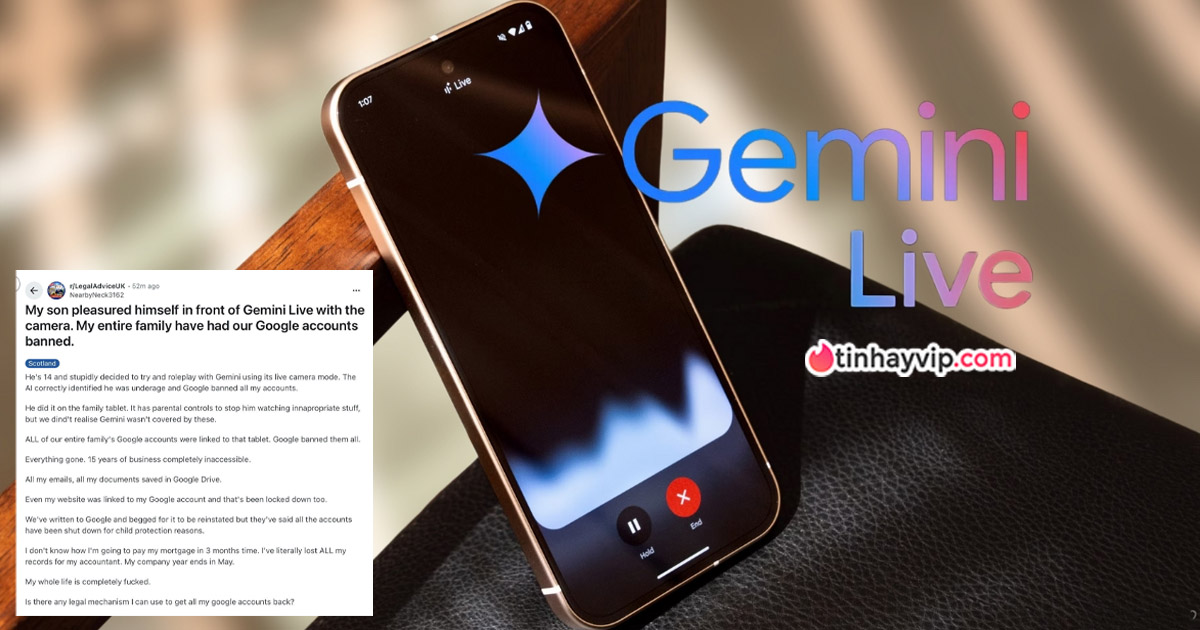 Vào ngày 31/3/2026, một phụ huynh ở Anh đã lên Reddit thuật lại câu chuyện con trai 14 tuổi dùng máy tính bảng gia đình để “nhập vai tình dục” với Gemini Live qua camera. Hậu quả, Google không chỉ khóa tài khoản của cậu bé mà còn truy quét theo thiết bị, xóa sạch tài khoản của bố mẹ và cả chị gái đang học xa nhà.